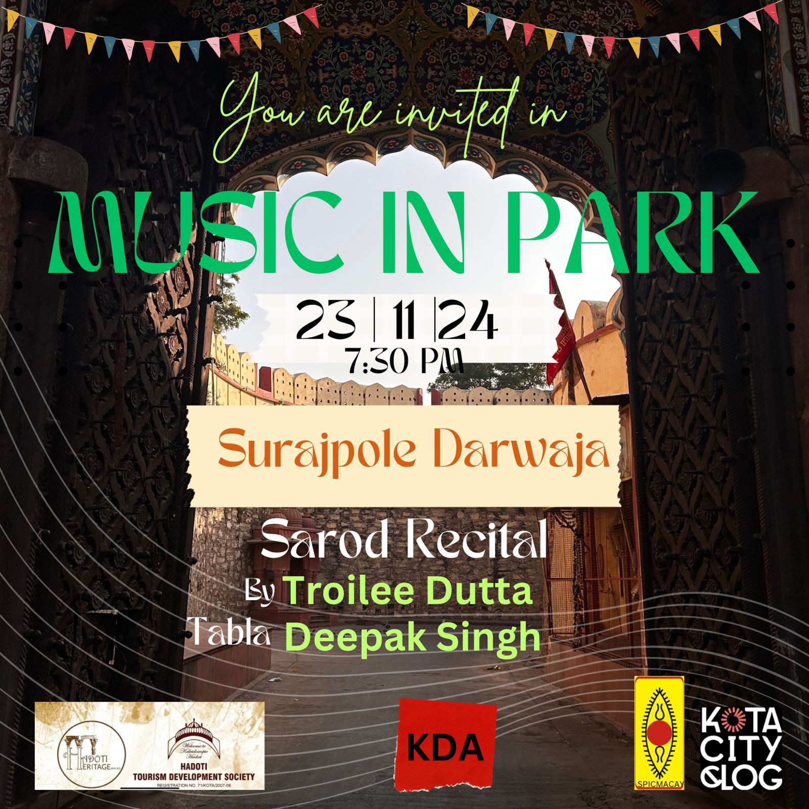 केडीए, हाड़ौती हैरिटेज वॉक्स, हाड़ौती पर्यटन विकास समिति एवं स्पिक मैके ने ‘‘म्यूजिक इन पार्क’’ एक नई पहल शुरू की है। इसका उद्देश्य कोटा की समृद्ध विरासत और ऐतिहासिक स्थलों को बढ़ावा देना है। इसके तहत हर माह कोटा शहर के विभिन्न धरोहर स्थलों पर शास्त्रीय संगीत और नृत्य प्रस्तुतियों का आयोजन किया जाएगा। यह शृंखला ऐतिहासिक स्थलों के प्रति आम जनता और पर्यटकों में रुचि जागृत करने का प्रयास है, ताकि हमारी सांस्कृतिक धरोहर को सराहा और संरक्षित किया जा सके। इस कार्यक्रम में प्रसिद्ध सरोद वादक त्रोइली दत्ता के साथ तबला वादक दीपक सिंह प्रस्तुति देंगे।