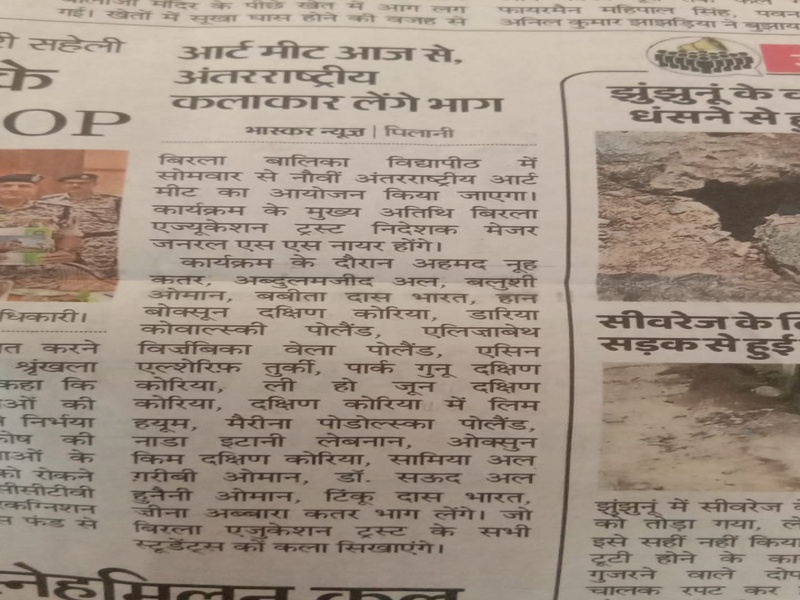9th International Art Meet, organised by Birla Education Trust at Birla Balika Vidhyapeeth, Pilani in Jhunjhunu District (Rajasthan) will be held from date 04 November 2024 to 10 November 2024. Several painting artists of international level are invited in the meet. They will also teach the skills of their respective arts to the students of the Pilani. The chief guest at the inauguration program of the meet shall be the Director of Birla Education Trust Major Gen. S. S. Nair (Retd.).