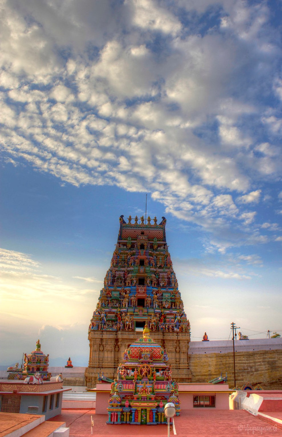 The Arulmigu Arthanaatheeswarar Temple Tiruchengode in Namakkal District is a famous temple for its main deity Arthanaatheeswarar To demonstrate the equality of men and women the main deity of this temple Lord Arthanaatheeswarar adopts the form of a hybrid man and woman Every year during the Tamil month of Vaikaasi between May and June the temple hosts a 5day festival to commemorate the Vaikaasi Vishakam Car festival Thiruveedhi Ula Thiruchengodu known as Kodimadha Chenkundrur in the Thevaram verses is one of the most important pilgrim sites for worshipping Lord Shiva The temple is situated atop a hill and faces west As the hill on which the temple is situated is red in colour the hill is named Thiruchengodu The height of the Tiruchengode Arthanaatheeswarar temple is 1900 feet above sea level The hilltop temple can be accessed by climbing up 1250 steps or by road transport through the paved roads The path to the peak is lined by mantapams or resting places for pilgrims Since the main deity of this temple represents Lord Shiva and Goddess Parvathi Shakthi as one the deity is adorned with both a dhoti and a saree The Vaikaasi Vishakam car festival is also known as the Sengottuvelavar Car Festival since the Utsava Moorthy Lord Murugan along with Lord Arthanaatheeswarar and his consorts is taken in procession Lakhs of devotees gather here every year during this car festival