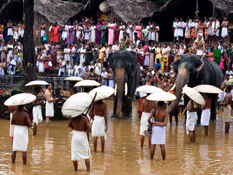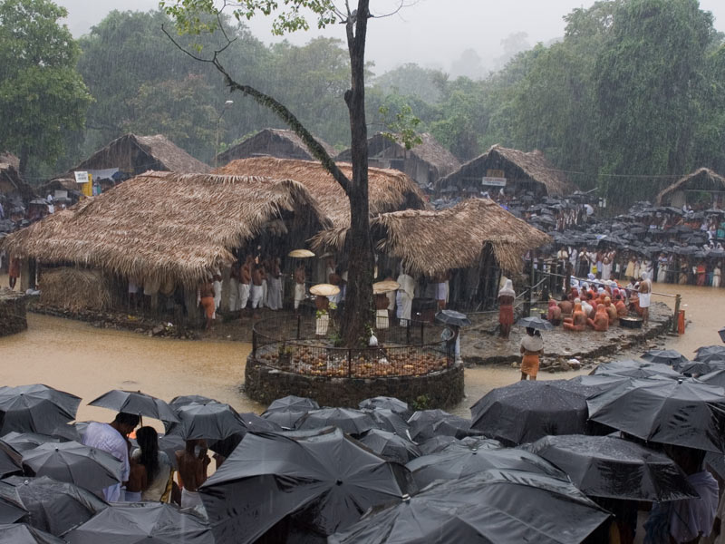 The devotees worship a swayambhoo lingam (self-created idol of Lord Shiva) and the temple is famous for its absence of a formal structure. The deity itself is placed on a platform made of river stones named manithara. The rituals are performed in thatched huts and begin with the Neyyattam (pouring of ghee). It begins with the bringing of a sword from Muthirerikavu in Wayanad. Another interesting spectacle seen is the Rohini Aaradhana where the priest embraces the swayambhoo Shiva linga as part of the ritual. One would also not wish to miss the Elaneer Vayppu, in which tender coconut is offered before the swayambhoo lingam. The festival ends with the Elaneerattam, in which the collected tender coconut water is poured on the idol by the head priest. It is a stunning visual spectacle, with nature itself sanctifying this divine event.